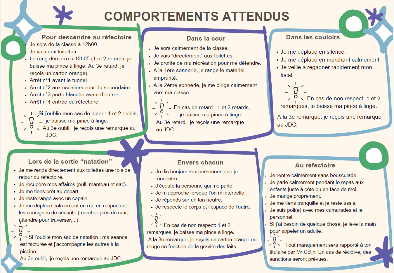 Un travail éducatif est prévu avec l’enfant sur base d’un rendez-vous avec la direction et l’adulte concerné pour trouver une solution aux différents problèmes (cartons de couleur).